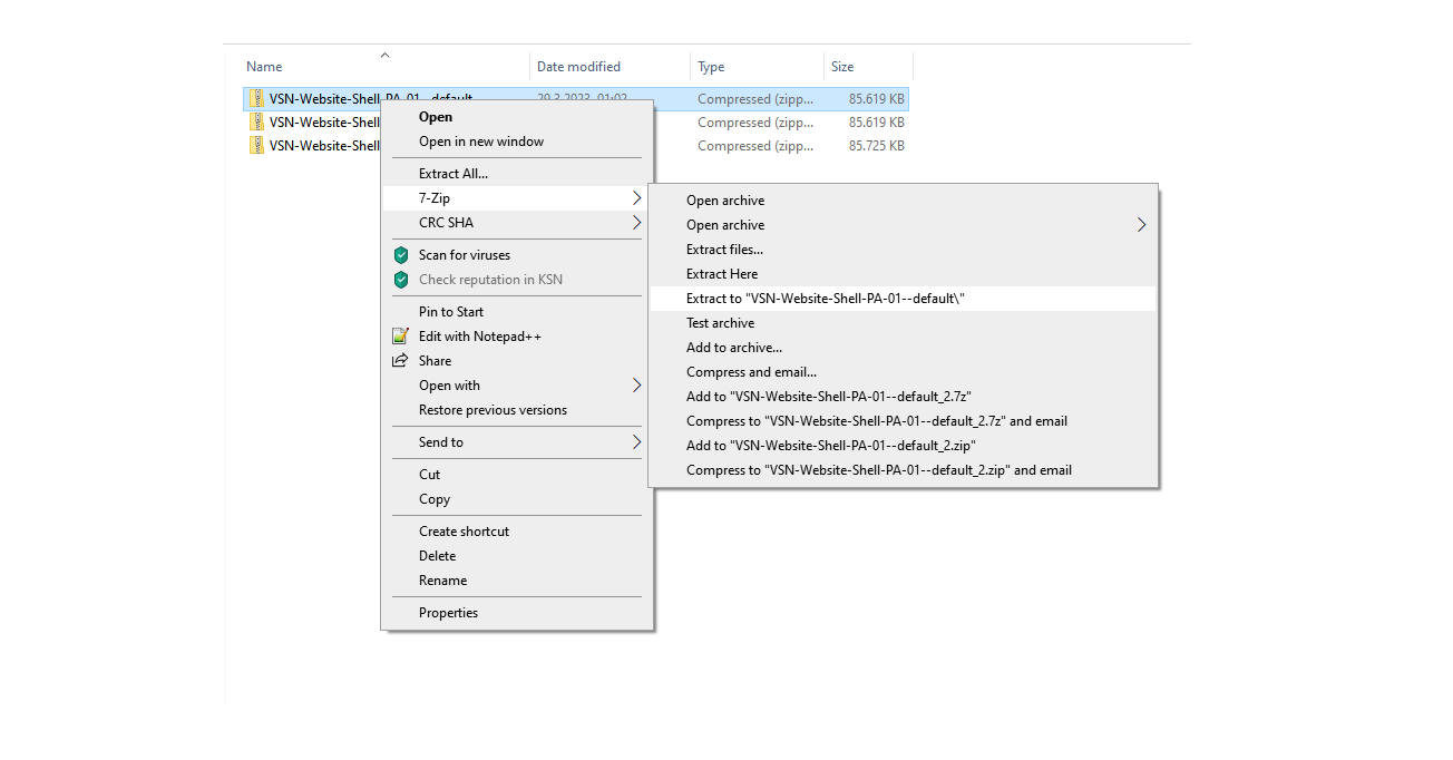 Select the downloaded VSN Website Template package archive file and extract it on your local hard drive using file compression software of your preference. 7-Zip is used in this tutorial.
