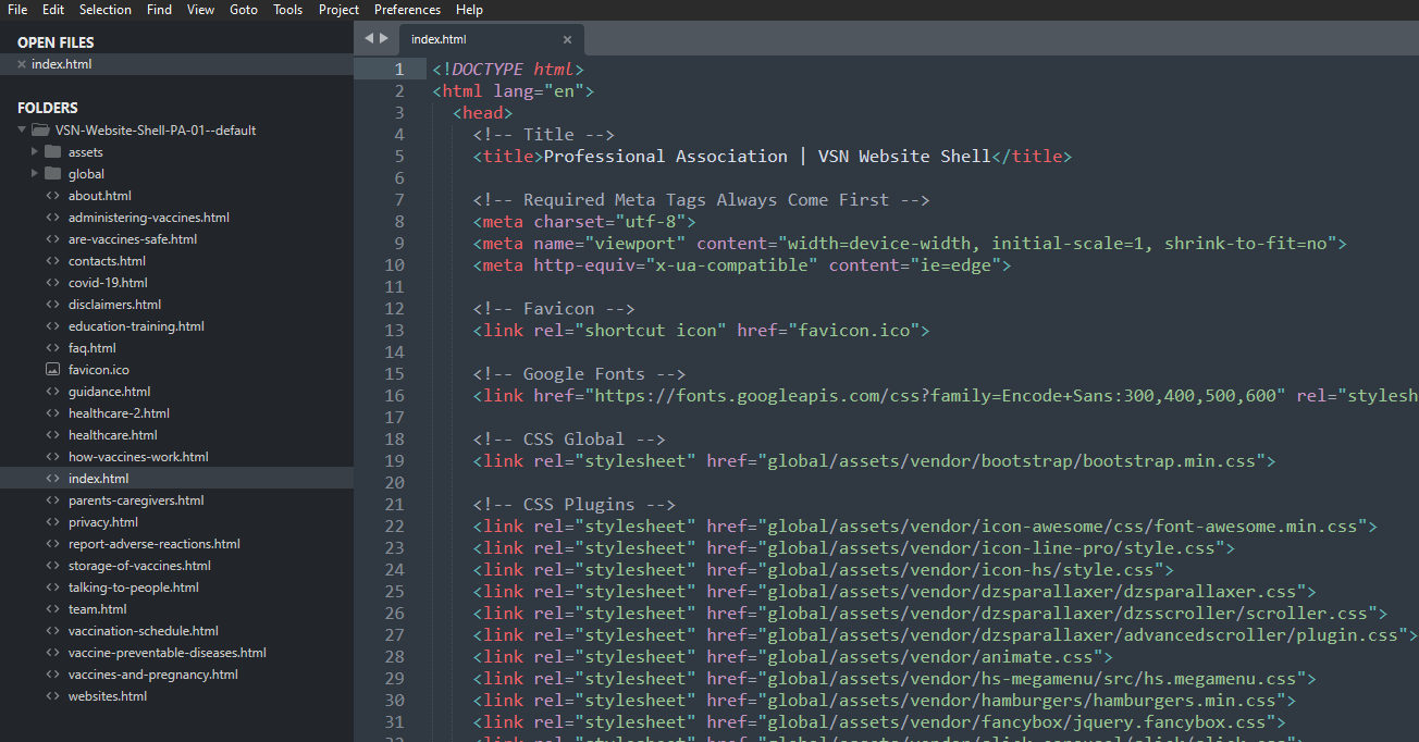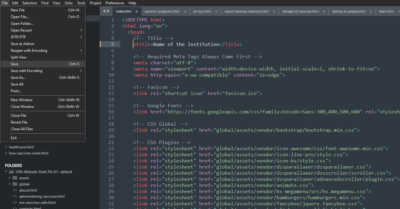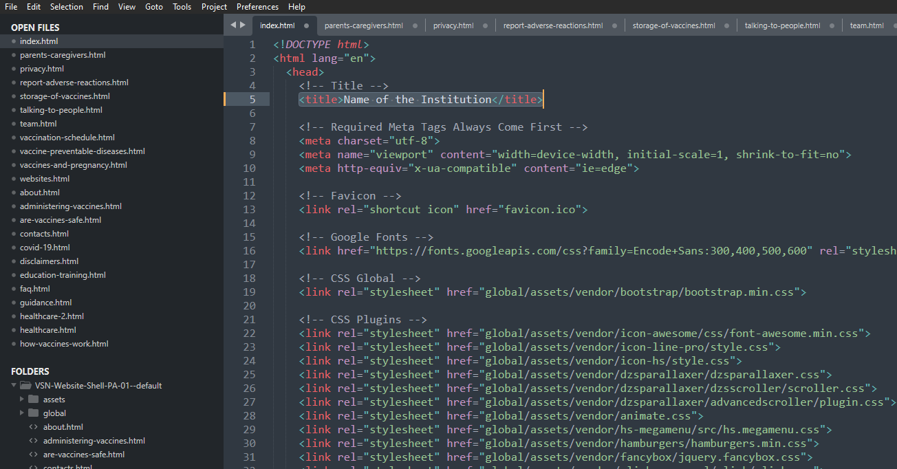After successful package download and extraction to local hard drive, VSN Template package needs to be edited to reflect Institution/Organization real life data. In this how-to we will cover basic setup and deployment steps, and since this package is a static HTML/CSS and JS template, we will edit individual .html files.