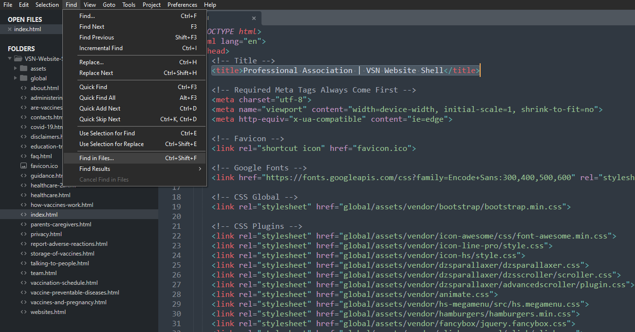 We will start by editing page title <title> in current index.html file and by using some of the Sublime Text features in all of the other pages as well. Select <title> tag from beginning to end and go to top menu Find/Find in Files or hit Ctrl+Shift+F.