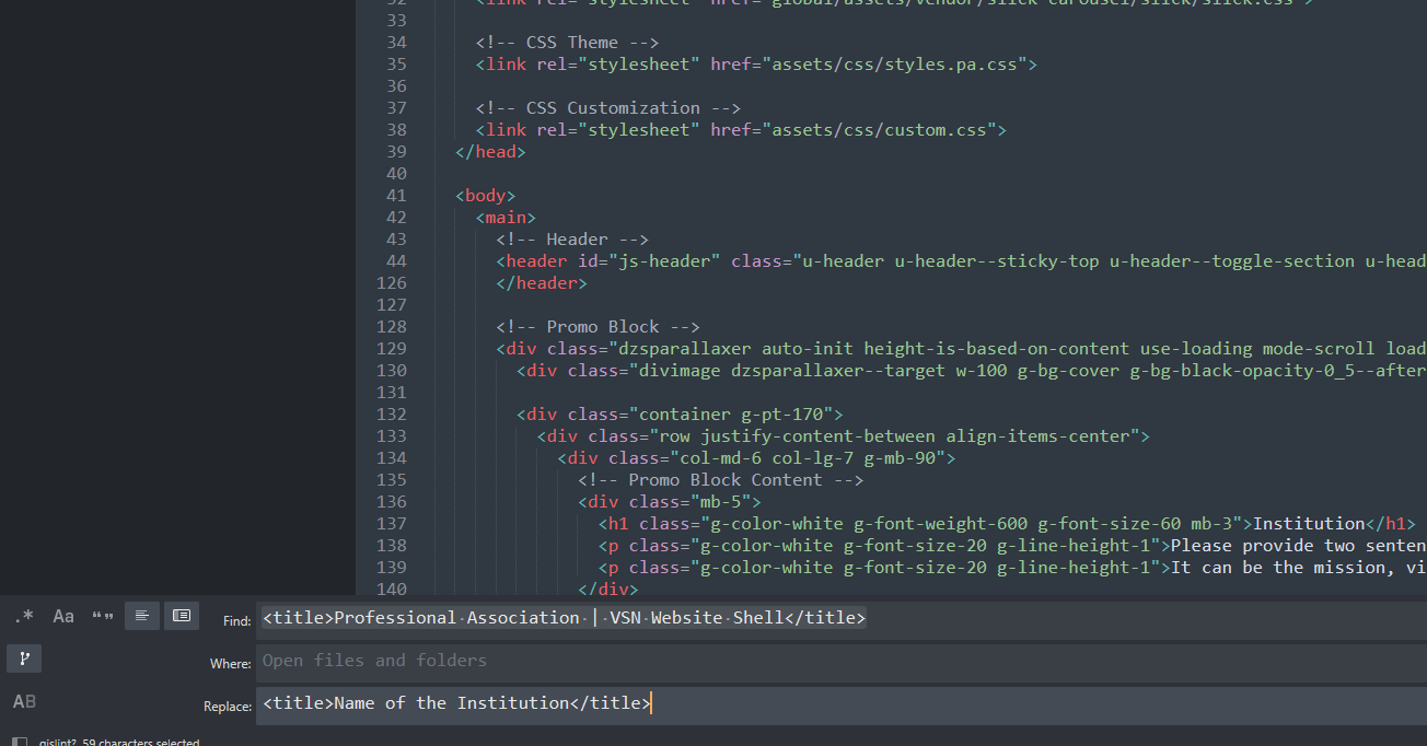 On the bottom of the editor you will notice a pop-up window where under replace you can enter actual name of the Institution. Enclose the name within <title> tag as shown on image and hit Replace button on the bottom right.