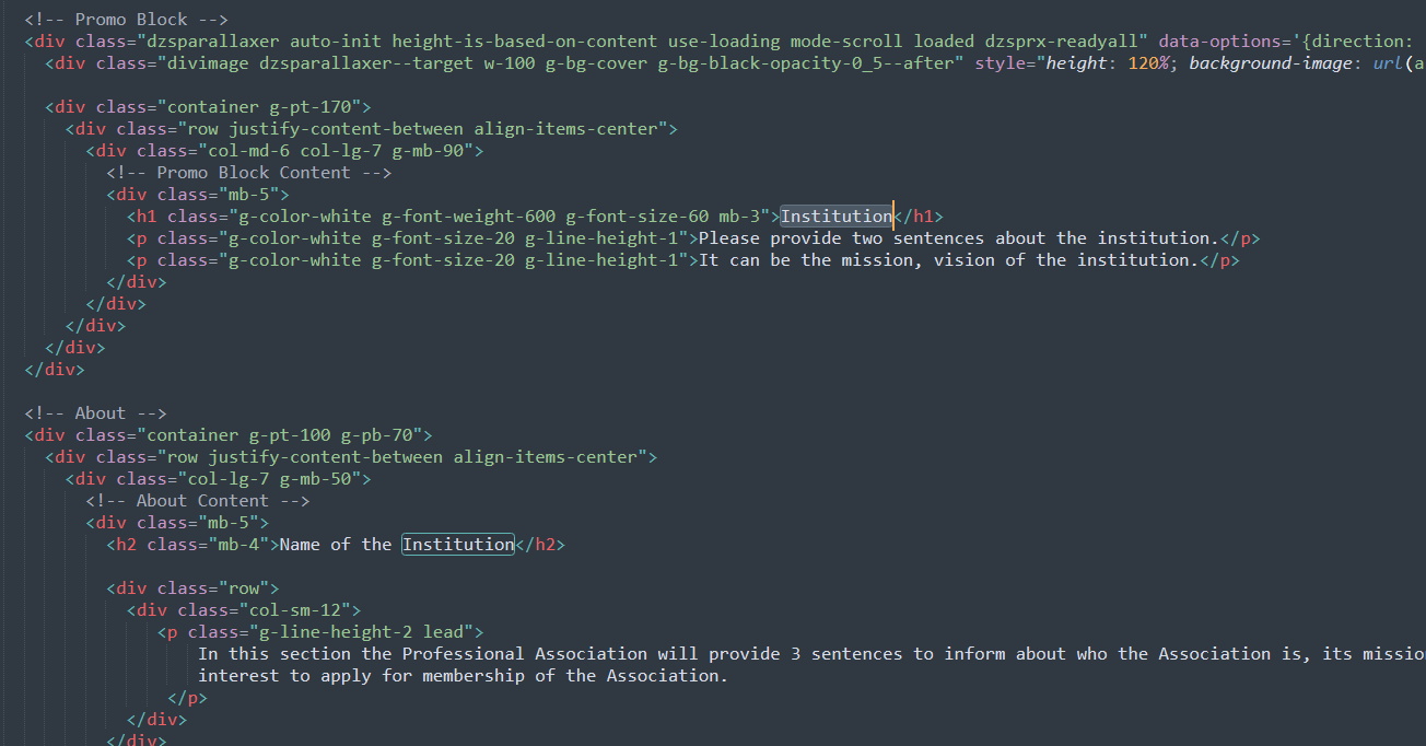 Continue going through each of the .html files, sections replacing placeholder content with real one that represents the Institution/Organization.