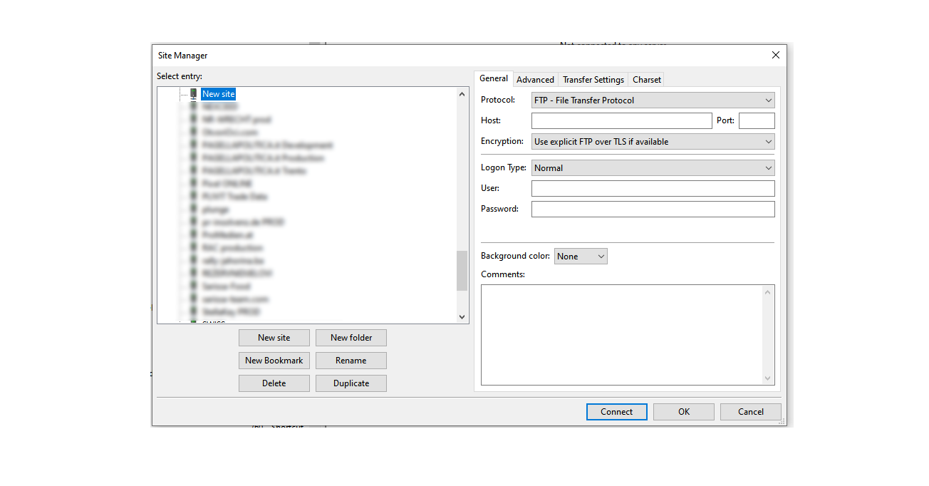 Open FileZilla and setp a connection with credentials provided by your hosting company. Once the credentials are entered and profile saved hit Connect button.