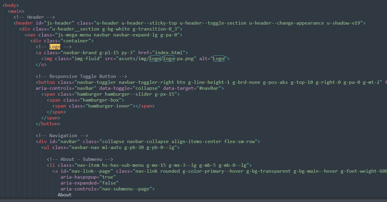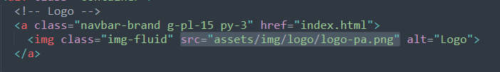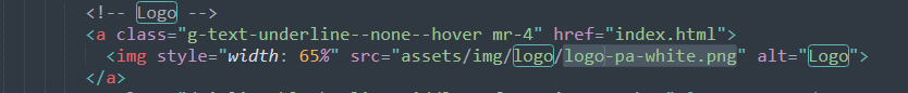 Clicking Find button on the search pop-up window repeatedly will circle between found instances within the index.html file. We are looking for <img> tag which holds the logo image source. src attribute of the <img> tag holds that information so once found we need to replace the default logo file name logo-pa.png with Institution logo file name.