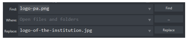 In the Find field enter logo-pa.png, in the Replace field enter the Institution logo file name and hit Replace button on the bottom right. Sublime will prompt you about how many occurrences across number of files will be replaced so hit Replace to confirm.